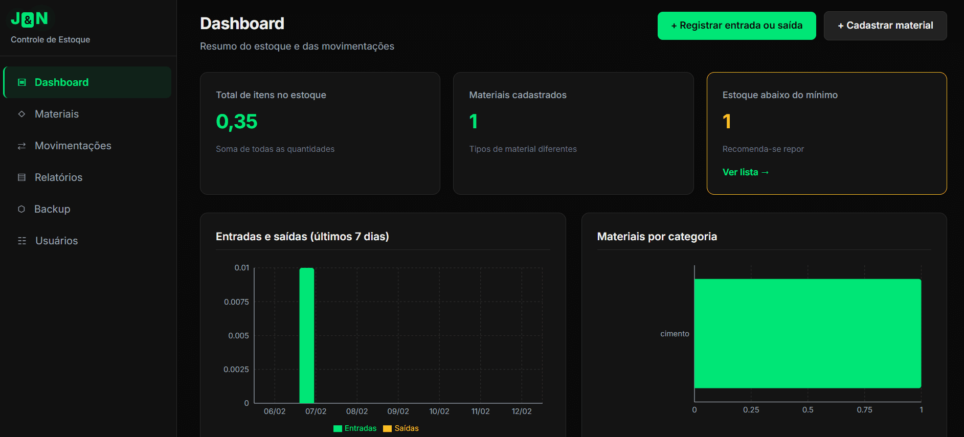 Sistema de controle de estoque para depósitos. Dashboard, cadastro de materiais, movimentações, relatórios e backup. Funciona 100% offline com SQLite.