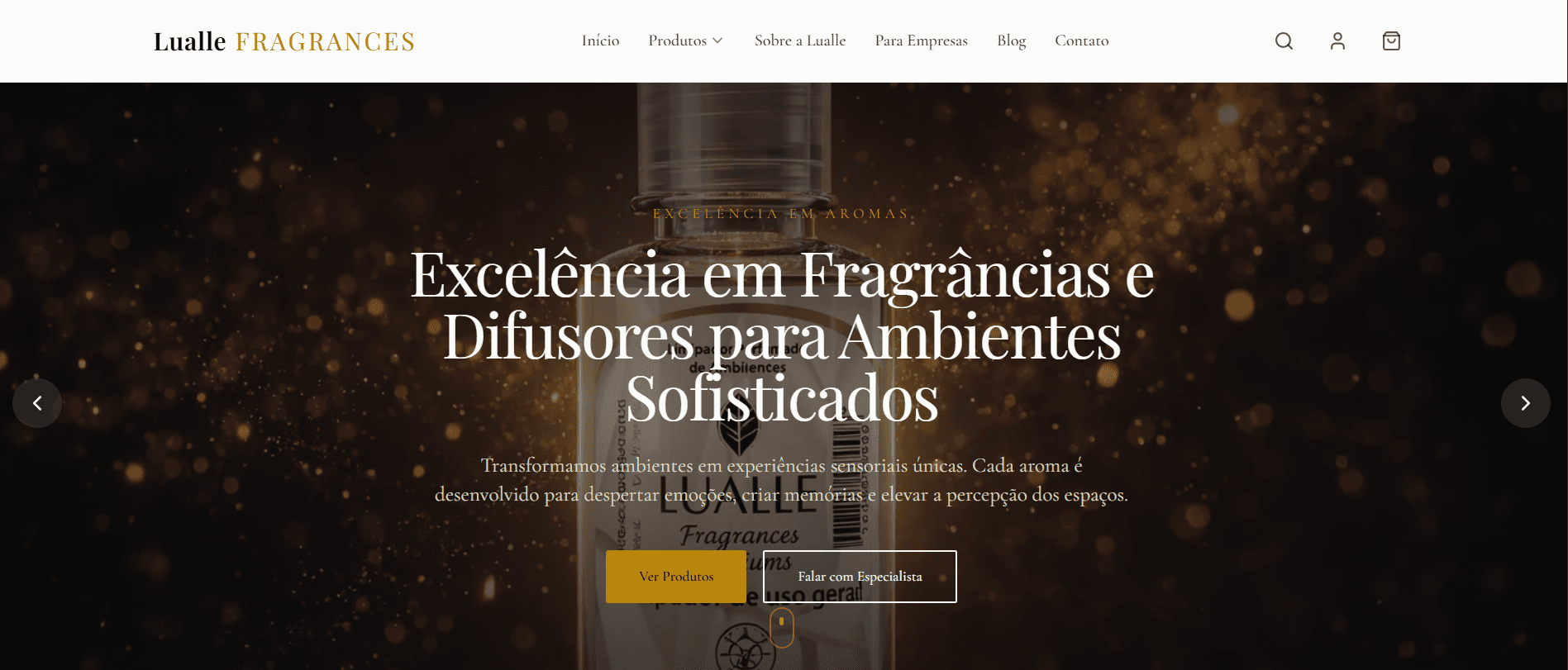 Site institucional e e-commerce de fragrâncias e difusores. Catálogo, produtos e conversão para ambientes residenciais e corporativos.