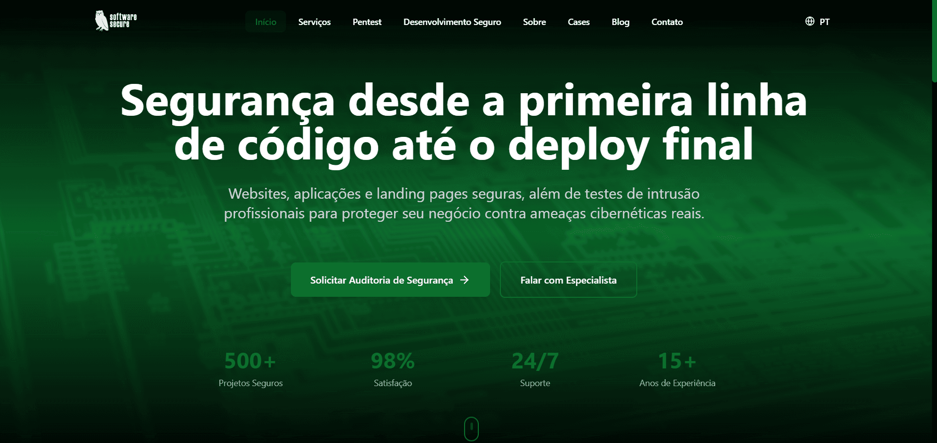 Site institucional da Software Secure. Presença digital, serviços de segurança e canal de contato com clientes.