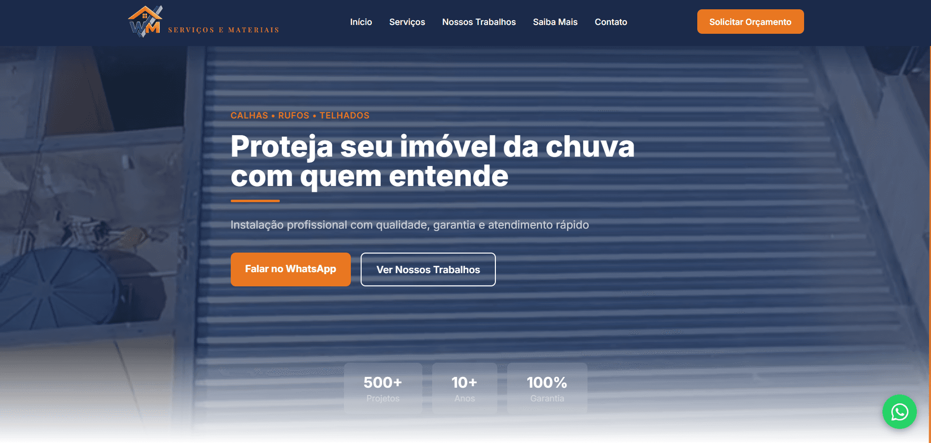 Landing page de conversão para empresa de calhas, rufos e telhados em São Paulo. Focada em orçamento rápido pelo WhatsApp e apresentação dos serviços.